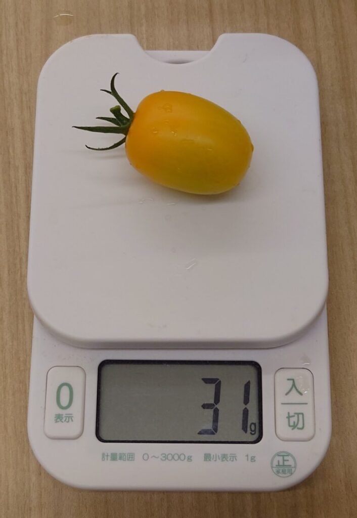 左写真左上。120個実が付いた花枝も、一番根元の部分が色づき始めました。先端部はやっと膨らみ始めているんですが・・。上の写真ですが、平均は収穫初期の現在は30グラム位で、最盛期には25グラム位になります。盛夏では凄まじい数を採りますけど、18~24グラム位の食べ頃サイズを大量に採る事になります。それでも売っているアイコより全然大きいですよ。